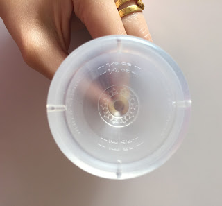 杯口有四個氣孔,杯子在身體裡容易打開;杯身兩邊有刻度,一邊是1/4oz和1/2oz,另一邊是7.5ml和15ml,可以觀察流量的多少。我認為設計上如果不止兩條刻度會更好,不用在1/2oz跟15ml就止步吧。