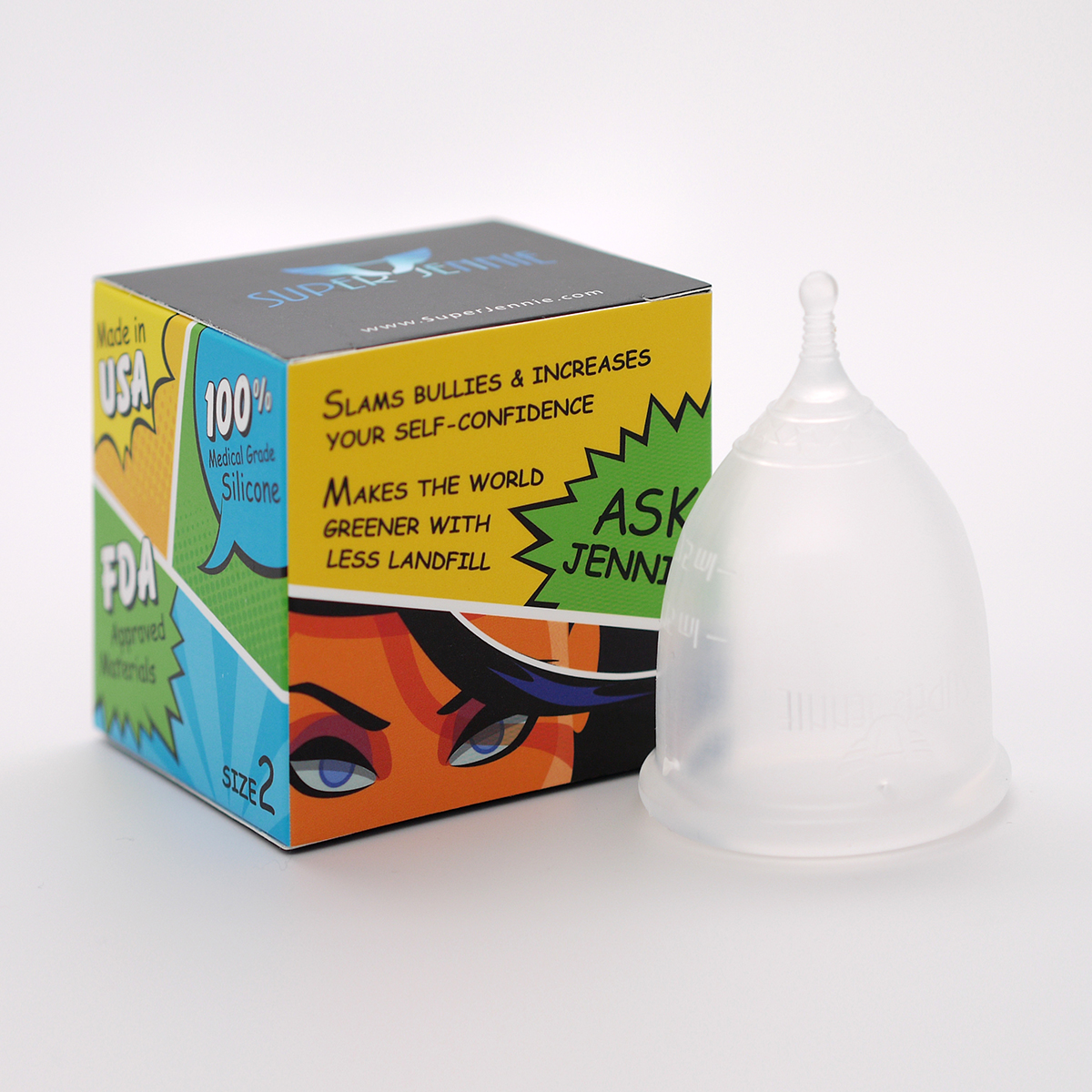 Super Jennie大概於2015年早期推出,現時提供兩個尺寸(Small和Large)和三種顏色(Clear,Teal和Blue)。物料是醫療級矽膠,而容量、高度、闊度等可參照以下兩張官網圖片。