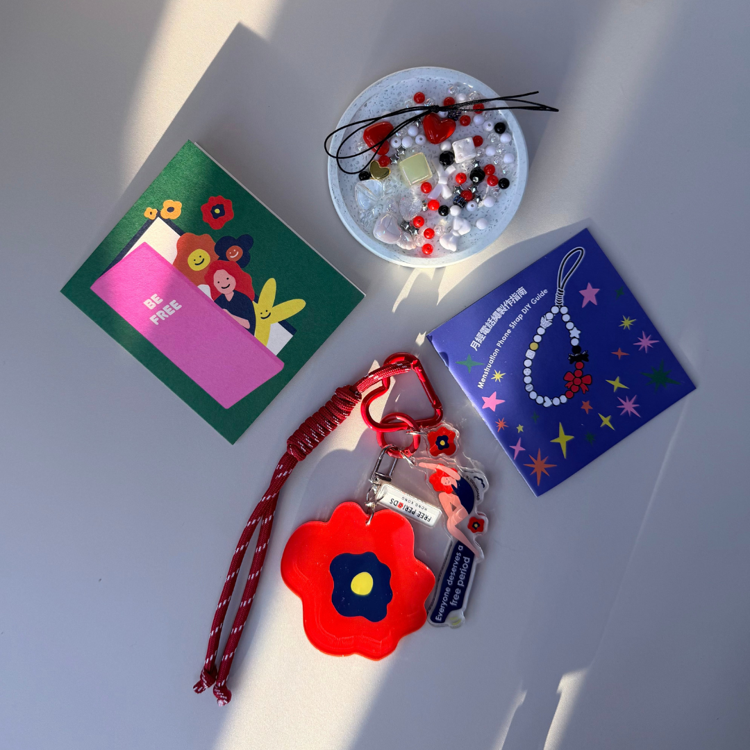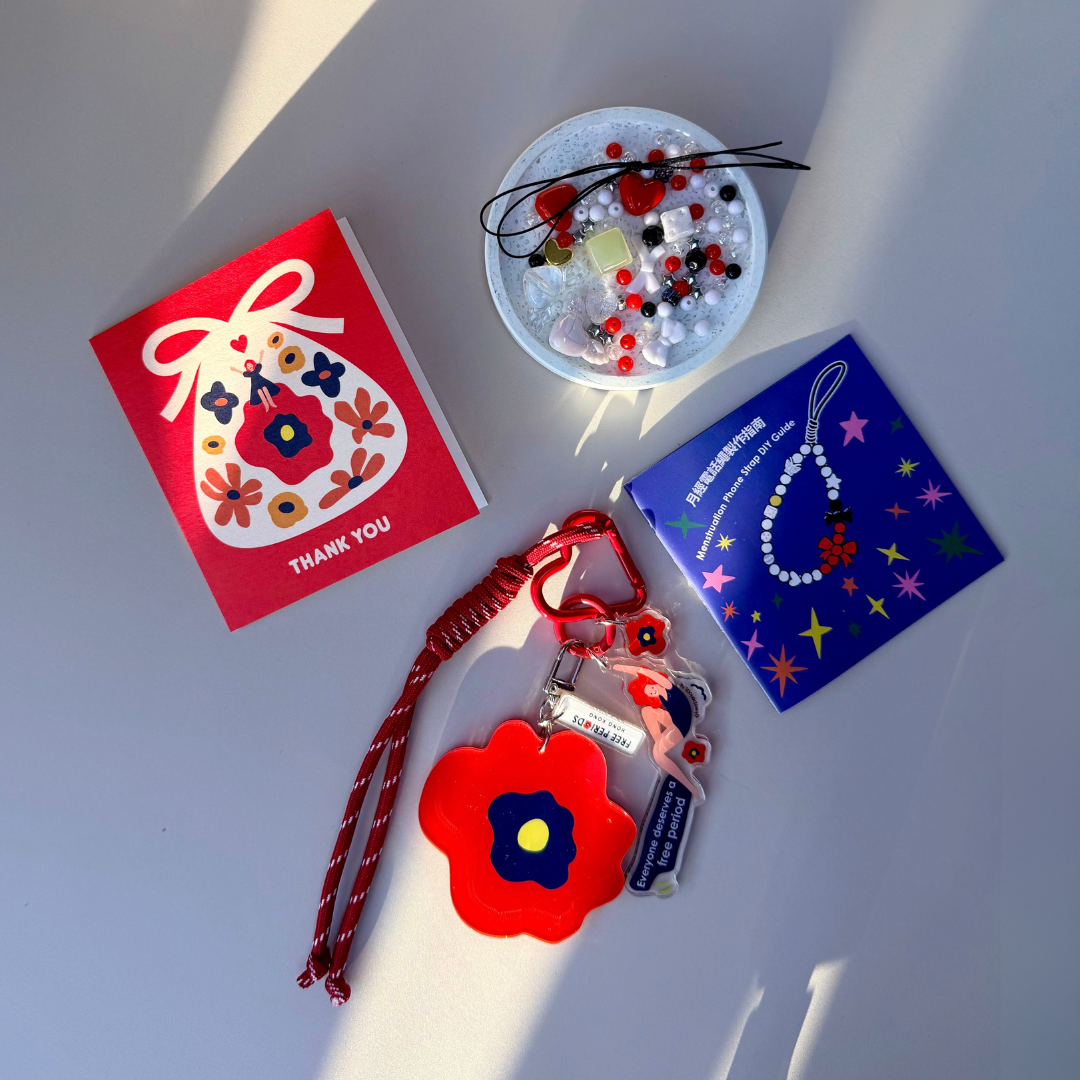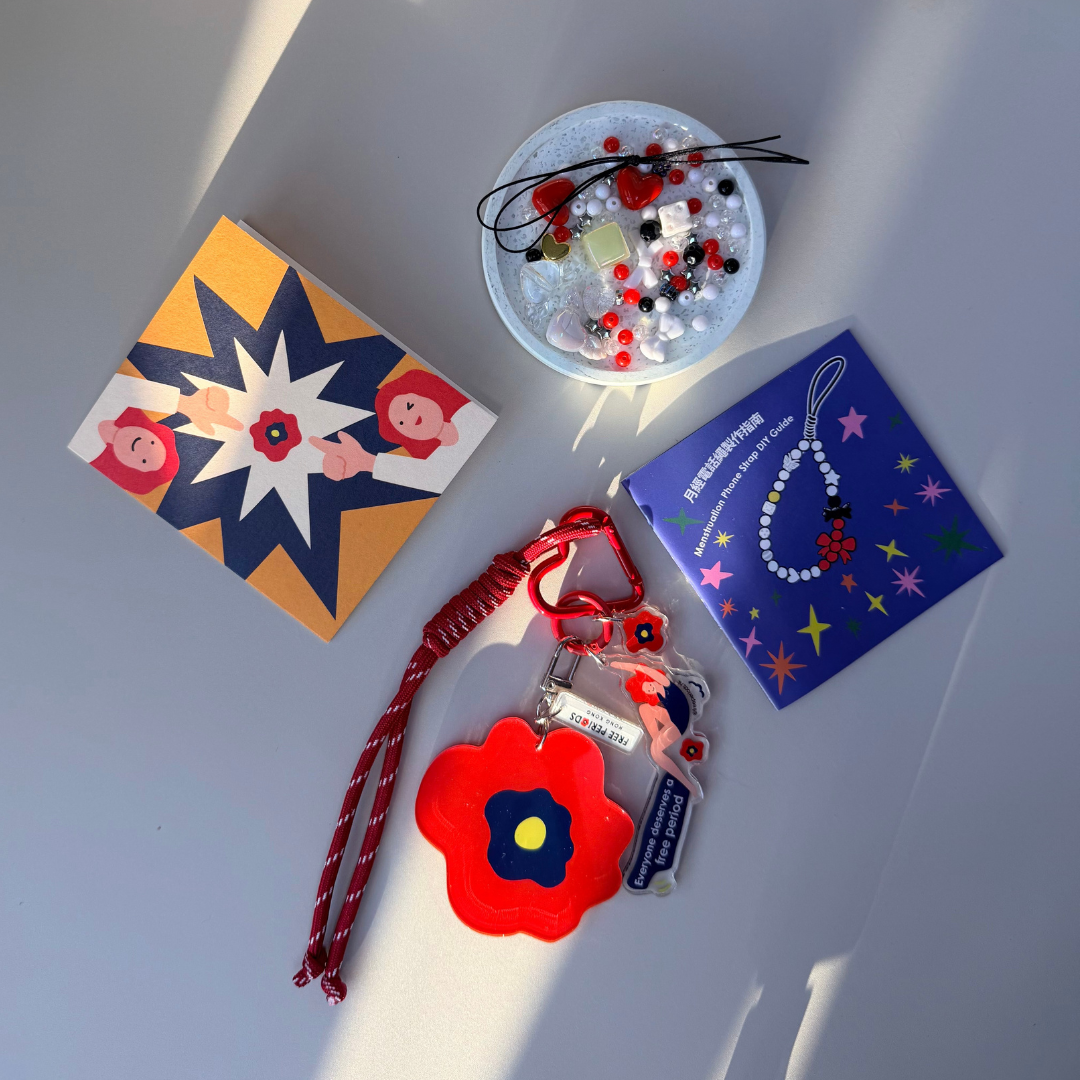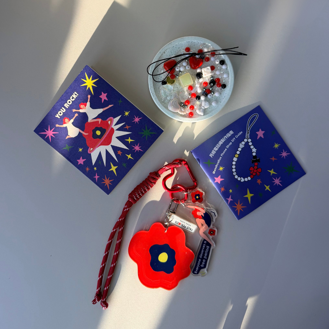 內容:「Everyone deserves a free period」鎖匙扣 x1、FPHK Logo 隨身鏡 x1、DIY 月經電話繩材料包 x1、萬用繩 x1、隨機萬用卡 x1、Hana Mirai 木調精油(10ml)x1